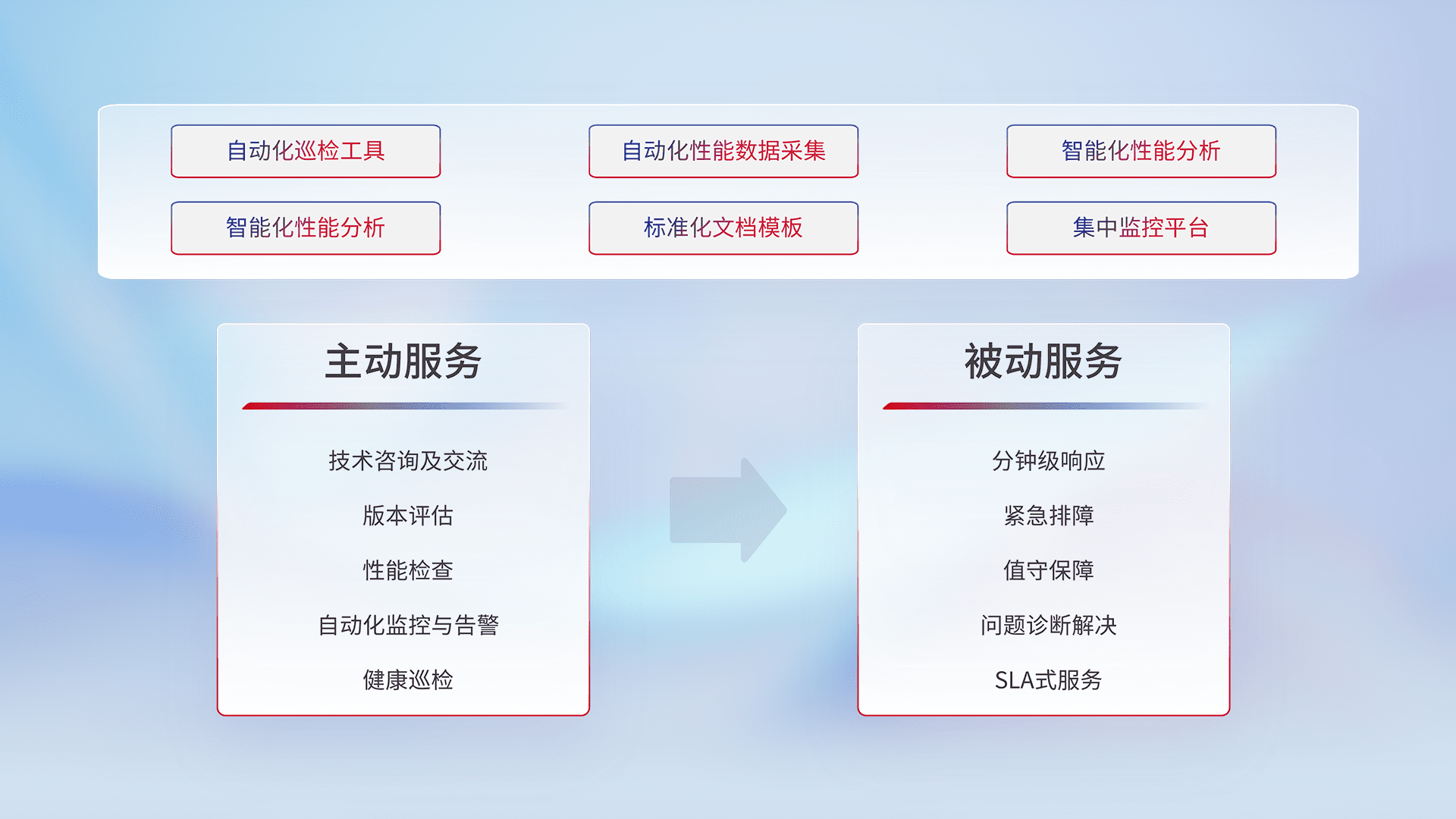 智能化工具和标准化文档,,保障服务质量,,,提供主动服务(包含技术咨询、、版本评估、、性能检查、、、自动化监控与告警、、、、健康巡检)和被动服务包含(分钟级响应、、、紧急排障、、、、值守保障、、、、问题诊断解决、、SLA服务)。。。。